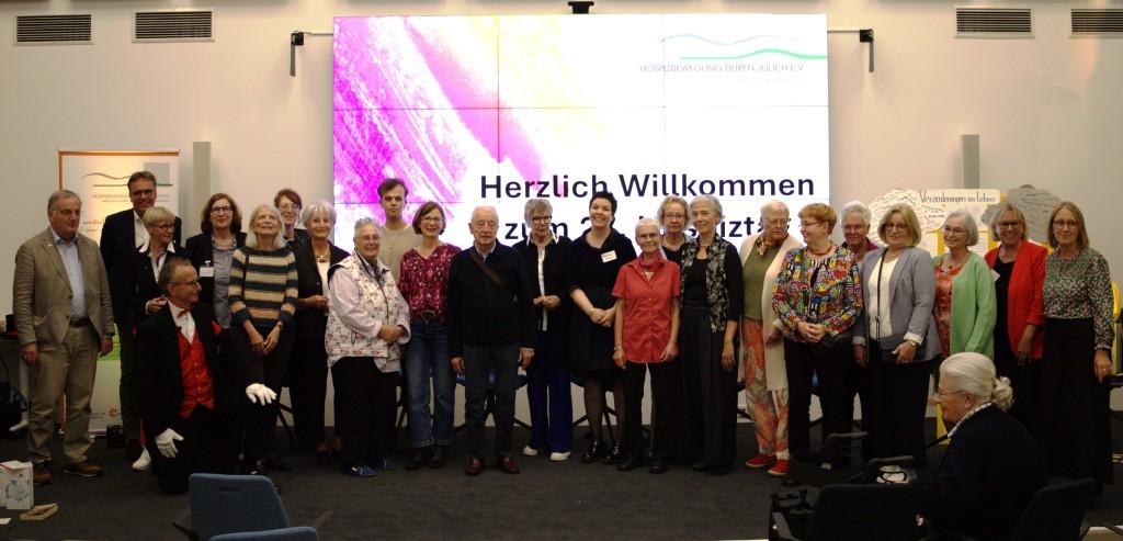 Auf dem Bild: Die Ehrenamtlichen der Hospizbewegung Düren-Jülich e. V. und die Referent*innen zum gemeinsamen Abschlussbild auf der Bühne © Hospizbewegung Düren-Jülich e.V.