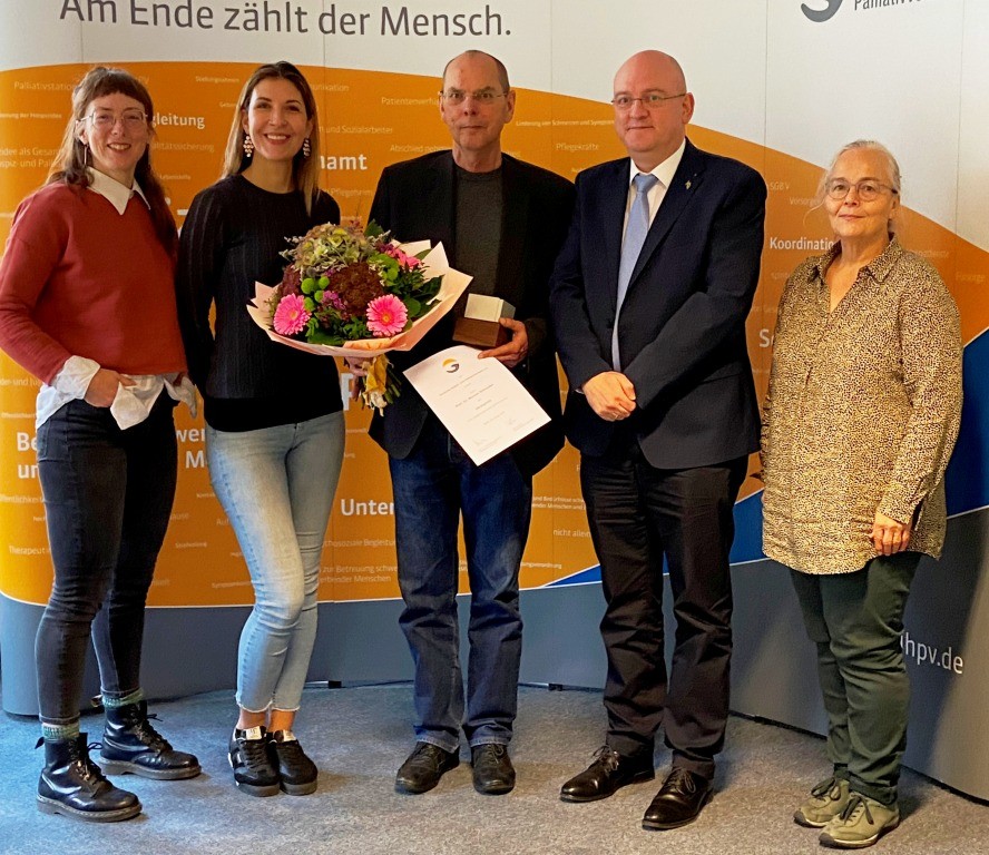 Prof. Werner Schneider ist Preisträger des DHPV-Ehrenpreises 2025 in der Kategorie Strukturen und Rahmenbedingungen. Zum Neujahrsempfang konnte er nicht dabei sein. Nun war endlich Gelegenheit, ihm den Preis persönlich zu überreichen. Der DHPV würdigt Werner Schneider mit diesem Preis für seine Unterstützung insbesondere beim Aufbau der Spezialisierten Ambulanten PalliativVersorgung (SAPV) in Bayern, zudem für sein jahrelanges Engagement als Sprecher und Mitwirkender des wissenschaftlichen Beirats des DHPV. Als einer der renommiertesten Wissenschaftler in der Hospizforschung hat er aus soziologischer Perspektive über Jahrzehnte die inhaltliche Auseinandersetzung mit Hospizarbeit und Palliativversorgung geprägt und vorangebracht, sei es mit seinen Artikeln und Schriftleitungen für die hospiz zeitschrift, als Ko-Autor der DHPV-Studie "Ehrenamtlichkeit und bürgerschaftliches Engagement in der Hospizarbeit (EbEH) – Merkmale, Entwicklungen und Zukunftsperspektiven" und vielem anderen mehr. Dafür gilt Werner Schneider der tiefste Respekt und Dank.